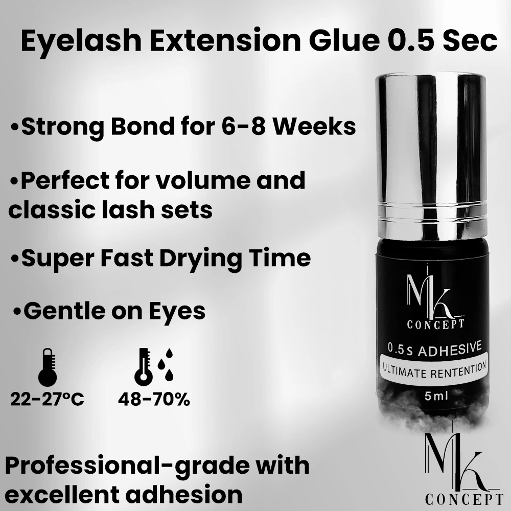 Achieve flawless, long-lasting eyelash extensions with MK Concept Eyelash Extension Glue 0.5 Sec. Designed for professional lash artists, this premium eyelash glue offers a rapid drying time of just 0.5 seconds, allowing for efficient application and reduced client waiting time. Suitable for both Volume and Classic lashes, it performs excellently in high humidity conditions (RH 48-70%) at temperatures between 22-27°C. The advanced formula provides a strong bonding strength that ensures lashes stay in place for 6-8 weeks, making it one of the most reliable lash adhesives on the market.