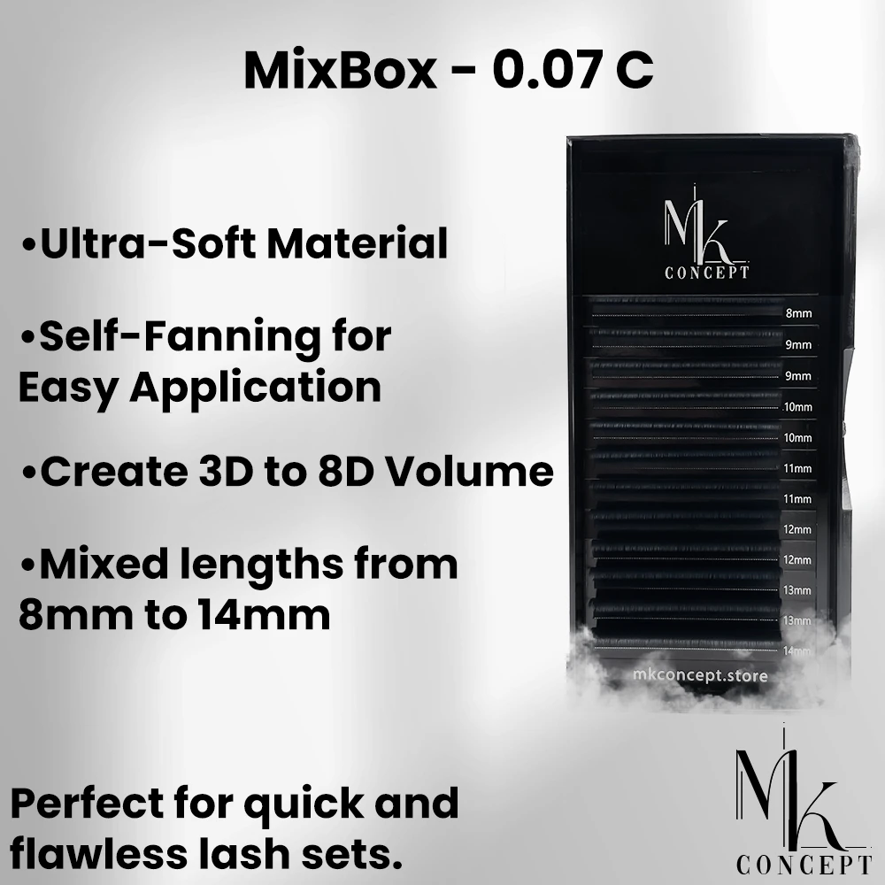 Discover the ultimate solution for volume lashes with the MK Concept Lashes Easy Fan – MixBox – 0.07 C. This mix box features self-fanning lashes with a 0.07mm thickness and C curl, perfect for creating 3D to 8D lash looks in seconds. Designed for both “1:1 Technique” and “Volume Technique,” these easy fan lashes save time and provide flexibility for lash artists. Made from high-quality, allergy-free, synthetic fibers, these lashes are lightweight, soft, and comfortable to wear. The mixed lengths from 8mm to 14mm offer versatility for various lash styles. Whether you’re a professional lash artist or a beginner, these easy fan lashes are ideal for achieving dramatic volume with ease. Explore more sizes and curls in the MK Concept collection for a complete lash extension experience.